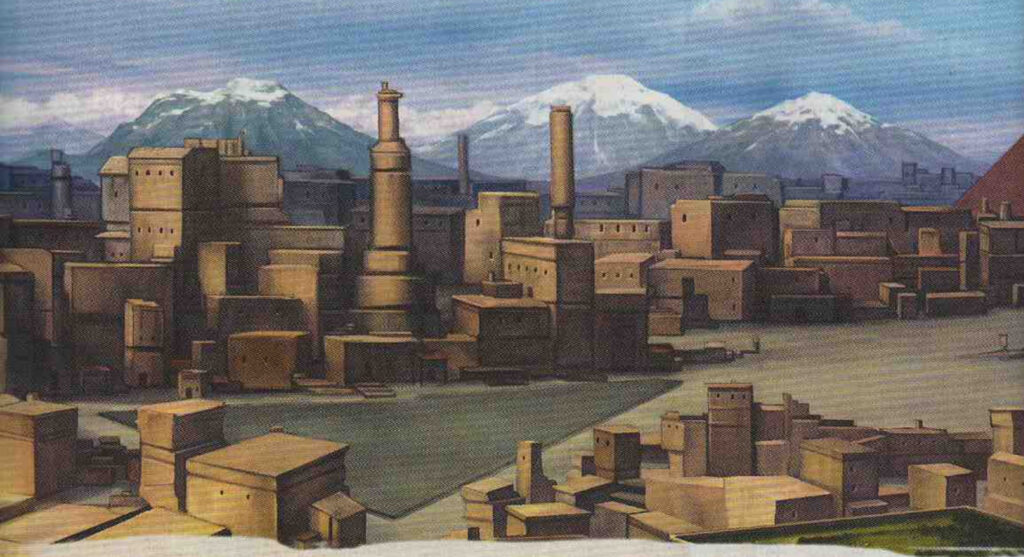 Der Aquädukt im Norden der Stadt führt das Wasser aus den kilometerweit entfernten Bergen fast direkt in die Stadt und füllt die Zisterne, aus der viele Einwohner ihr Wasser beziehen. In der Mitte der Stadt, eingerahmt von einer Pyramide im Westen und einer im Osten, steht ein zentrales, imposantes Bauwerk, das die Baukunst der Erbauer dieser Stadt eindrucksvoll demonstriert. Jedes Stockwerk dieses Bauwerks ist 25 Fuß hoch. Eine 2 Fuß breite, steile Sternentreppe führt von Stufe zu Stufe bis zur Spitze der Pyramide.
