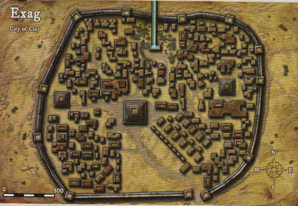 Uralt und geheimnisvoll erhebt sich Exag aus den umliegenden Hügeln. Hohe Mauern aus rot gebranntem Lehm umgeben die Stadt von allen Seiten. Innerhalb der Mauern erheben sich mehrstöckige Gebäude aus dem gleichen Lehm, um große Pyramiden und einen Platz, der von einer riesigen Zisterne beherrscht wird. Ein Aquädukt, das die Zisterne speist, reicht bis in die Hügel.