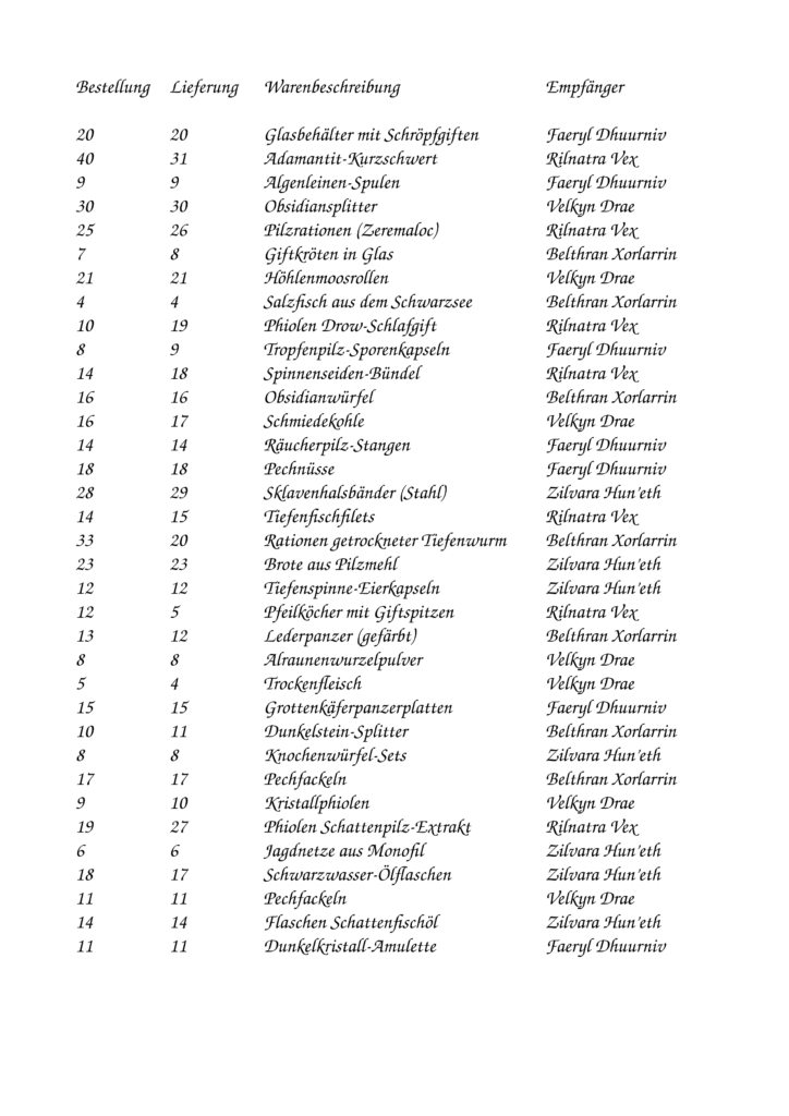 „Weil ich ihre Art zu spinnen erkenne. Sanftes Gift, das sich in ein Lied verwandelt. Haus Vae träumt schon lange davon, die Oberfläche in Blut zu tauchen – aber Träume allein gewinnen keinen Krieg. Dazu müssen Wellen geschlagen werden. Und die Wellen schlagen nun.“ Sorn, der immer nach Gelegenheiten sucht, den kleinen Vorteil gegenüber anderen Drow in Erelhei-Cinlu oder anderen Gegenden zu erringen, wagte es, nach Hilfsmitteln, die die Chance auf Erfolg bei der anstehenden Mission sicherzustellen vermögen könnten, zu fragen und betonte dabei, dass ja gerade ein besonders (gold)wertvolles Gruppenmitglied unter tragischen Umständen die Gruppe verlassen musste. Evelyn zieht eine Augenbraue hoch, als würde sie von diesem Ansinnen amüsiert werden: „Es gibt keinen Grund, unnötige Resourcen zu verschwenden. Wenn ihr mich überzeugen könnt, dass euer Auftrag ohne solche Gegenstände scheitert – werde ich euch geben, was nötig ist. Aber vergesst nicht: Was von mir kommt, gehört mir. Auf begrenzte Zeit nur… euch. Gunst ist die Währung, mit der wir hier herrschen. Aber wenn ihr Zahlen auf Pergament braucht: Gold, Einfluss, Schutz vor Feinden. Dinge, die für euch… langweilige Oberirdische möglicherweise wertvoller erscheinen als ein Lächeln von mir. Merkt Euch folgendes: Was ihr in meinem Namen an euch nehmt, bleibt in meinem Namen. Doch ich kann… auch großzügig sein. Bringt Beweise und Informationen unversehrt zu mir – und ich werde nicht zählen, wie viele Münzen sich zufällig in eure Taschen verirrt haben.“