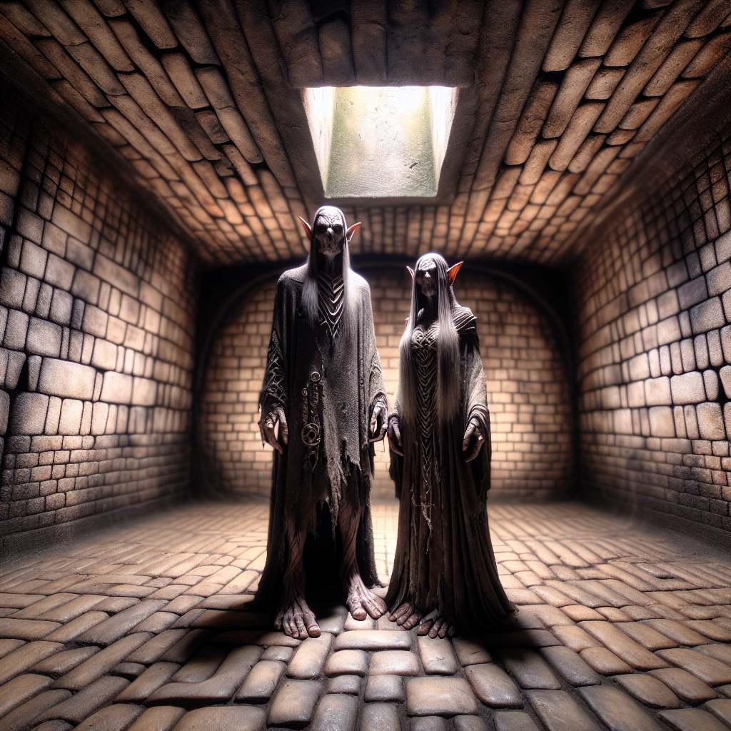 Unweit des Tores zu den Adelshäusern – jenem schwarzen Bogen aus poliertem Obsidian, in dem selbst das Licht der phosphoreszierenden Kristalle zu vergehen schien – drängten sich Drow wie Strömung um einen Felsen. Stimmen vermischten sich zu einem dumpfen Gemurmel, doch Zurgin, der Barde, hörte es sofort: das wiederkehrende Muster einer Geschichte, eines Gleichnisses, das wie ein giftiges Insekt von Ohr zu Ohr kroch. Er folgte dem Geräusch wie einer Melodie, die sich in den Gassen verfing. Ein kleiner Platz öffnete sich, und dort stand er: ein magerer Mann, in den Schatten eines schiefen Pfeilers gehüllt, die Stimme voll dunkler Bilder. Er sprach vom Kommen eines Schattens aus Schuppen und Zähnen, vom Atem, der die Oberwelt verschlingen würde. Um ihn hatte sich ein kleiner Kreis Zuhörer gebildet – Augen, die leuchteten, als hätten sie Feuer geschluckt.